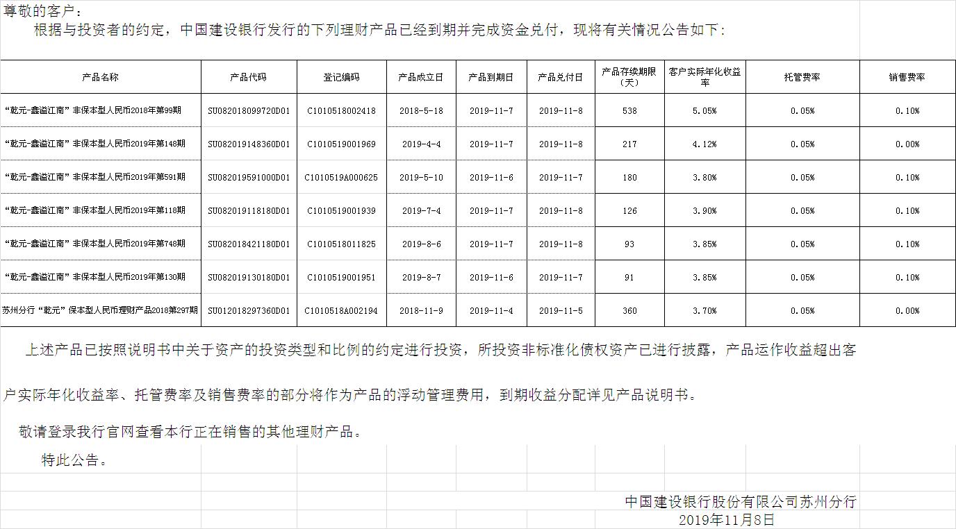 中国建设银行理财产品终止及清算公告